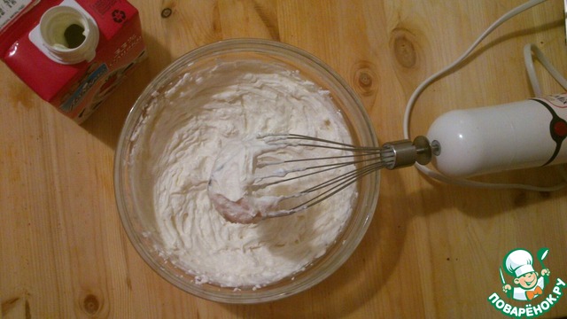 Взбиваем сливочный сыр с сахарной пудрой. Постепенно вливаем сливки. Продолжаем взбивать до загустения. Ставим в холодильник как и все остальное.