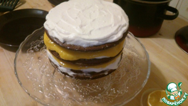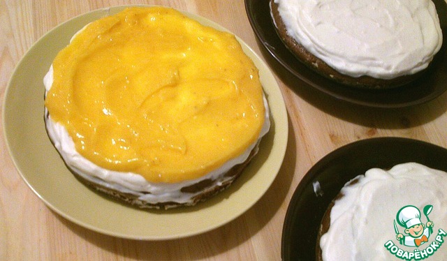 Нужно подождать пока крем уплотнится. Как только это произойдет, можно собирать торт!:) На 2 коржа наносим курд, кладем один на другой и накрываем третьим.