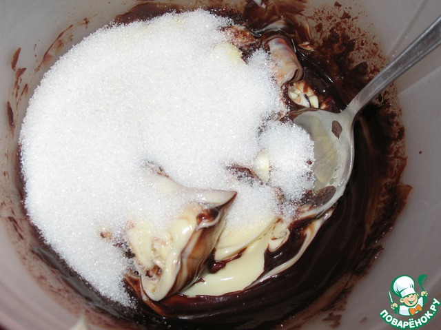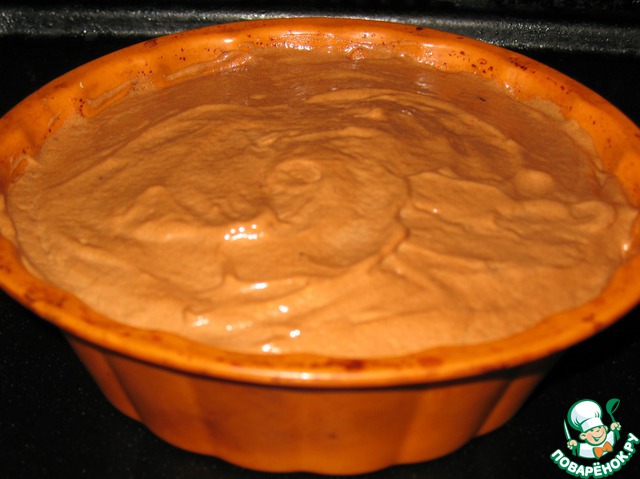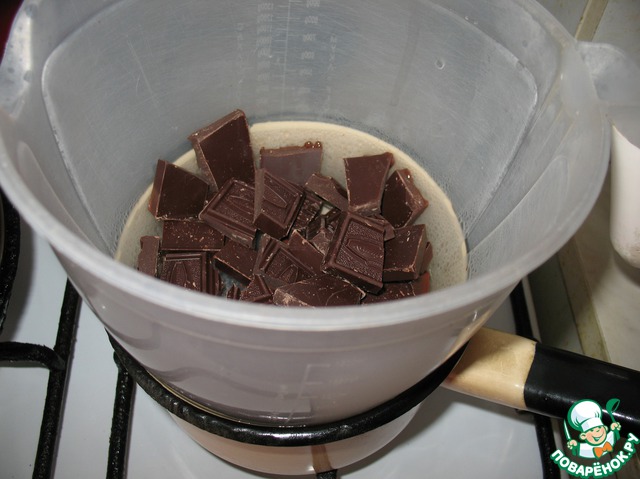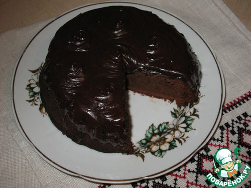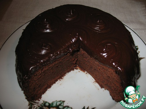 Это должно быть что-то шоколадное! Можно растопить шоколадку и полить - это проще всего и обалденно вкусно! Я же в данном случае поливала кремом: один стакан холодного молока взбила с 1/4 стак. муки и 1 ст. л. сахара; поставила на огонь и, постоянно помешивая, хорошо нагрела; затем добавила 100 г сливочных мягких ирисок, нарезанных предварительно на кусочки; постоянно помешивала, пока ириски полностью не растопятся; затем в горячую массу добавила три столовые ложки какао-порошка и 50 г сливочного масла; варила, помешивая, до загустения. Вот этим кремом я полила наш тортик.