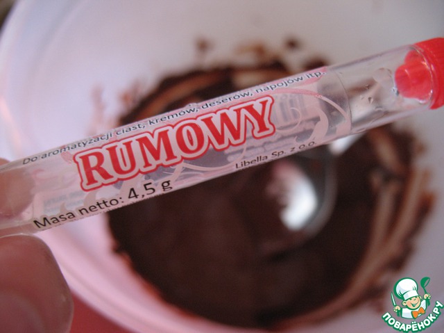Добавляем в наш шоколад ром (воду) или, как я в данном случае, водичку и капель пять ромовой эссенции.