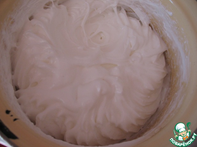 Взбиваем белки до крепкой пены с оставшимся сахаром и щепоткой соли.