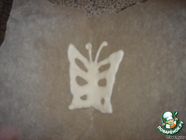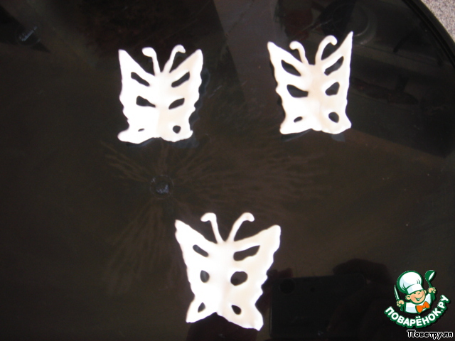 Бабочки из айсинга готовила неделю назад, пригодились. 1 белок взбиваем вилкой и постепенно добавляем сахарную пудру, в конце - лимонный сок.