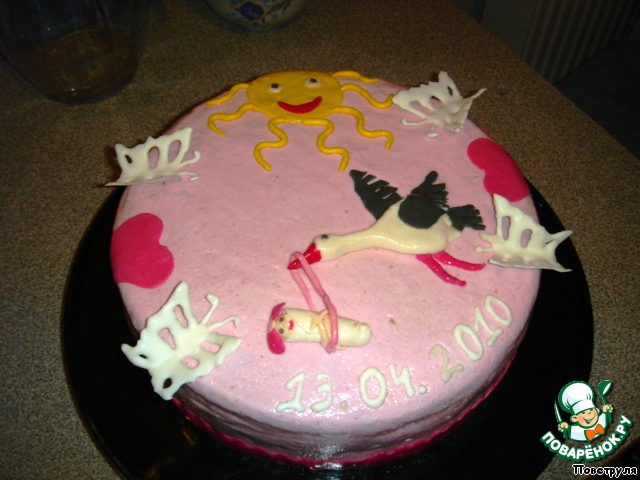 | Немного фантазии и торт на крестины для моей знакомой готов. Рецепт очень простой, а вот оформление может кому-то пригодится. Делала первый раз бабочек из айсинга, мне понравилось, поделюсь с вами. |