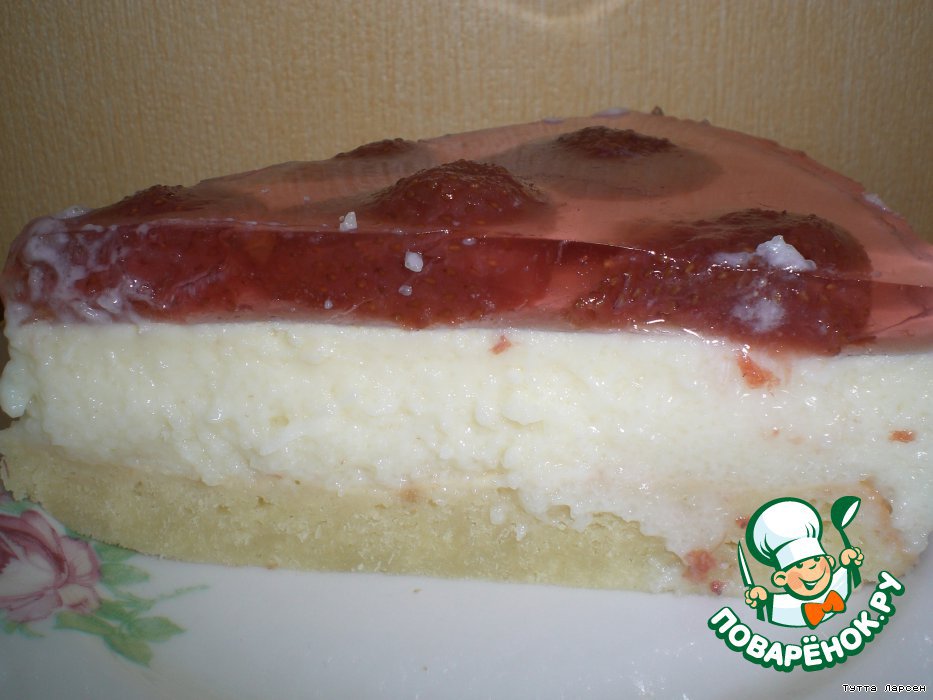 5. Достать торт, украсить его клубникой или любым другим фруктом, и залить заранее разведeнным и остужeнным в воде желе. И опять поставить в холодильник, до застывания.
