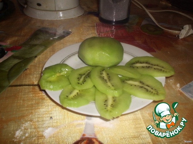 Нарезаем тоненько фрукты. Здесь дело вкуса - можно класть все, что угодно.
