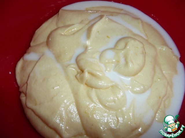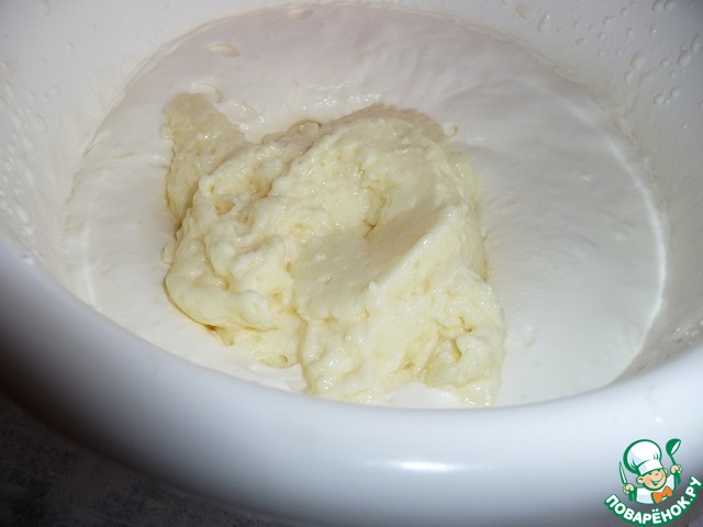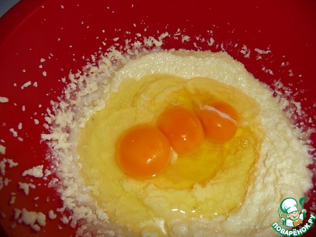Частями добавляем в яичную смесь и взбиваем до однородной массы.