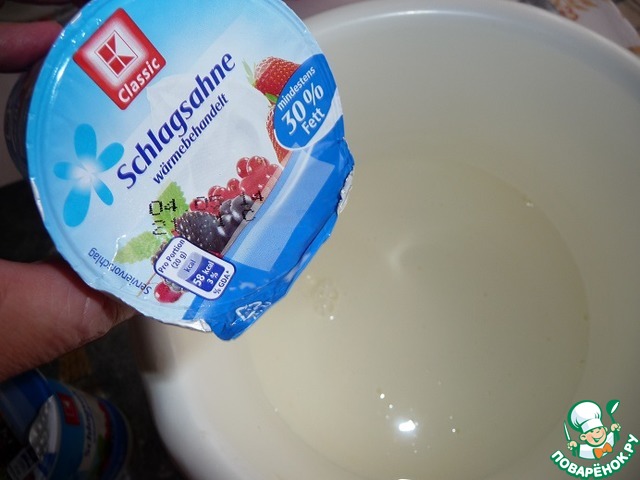 В другой миске взбиваем сливки, сахар, ванильный сахар. Крем должен быть похож на густую сметану.