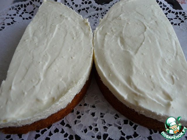 На бисквит одеть кольцо, не слишком плотно и залить кремом. Я не смиогла справиться со своим кольцом, и у меня крем не попал на бока бисквита. Заготовку торта убрать в холодильник на 6 часов, можно и больше.