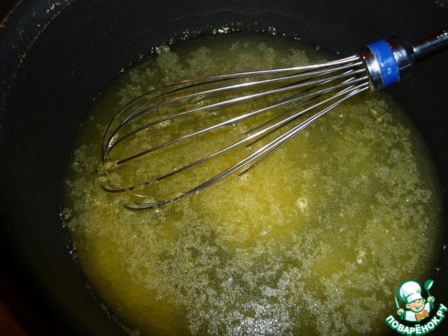 Добавляем слегка подтопленое масло, начинаем взбивать.