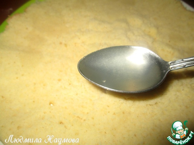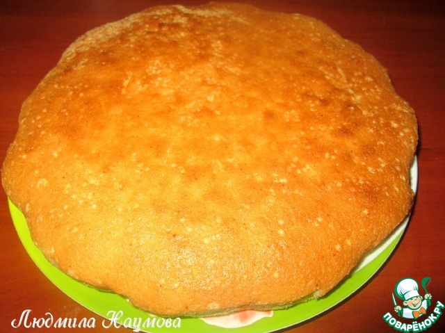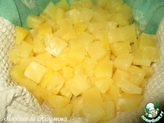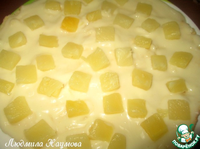 Остывший бисквит разрезать на 3 коржа, пропитать соком с ананасов.