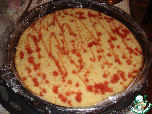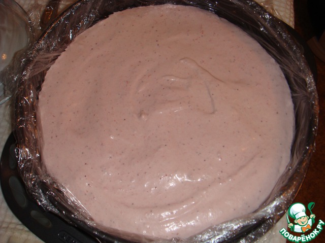 Разъемную форму выстелить пищевой пленкой. На дно выложить половину крема.