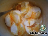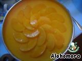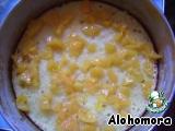 Теперь собираем торт: нижний корж смазываем пропиткой, ну той штукой, что мы делали в предыдущем пункте, и выкладываем мелко нарезанные персики.