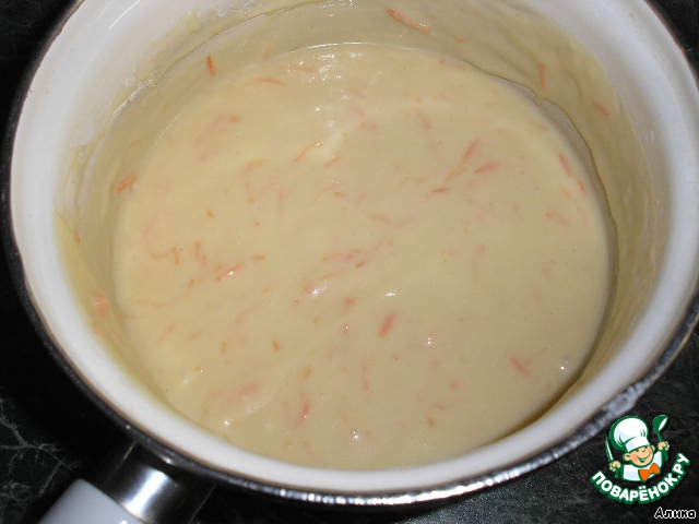 Морковь натереть на мелкой терке (я терла на средней на комбайне, поэтому получились длинные «морковочки»). Когда вы разрежете готовый торт, в нем будут видны оранжевые вкрапления моркови, листопад, торт ведь по осенним мотивам.