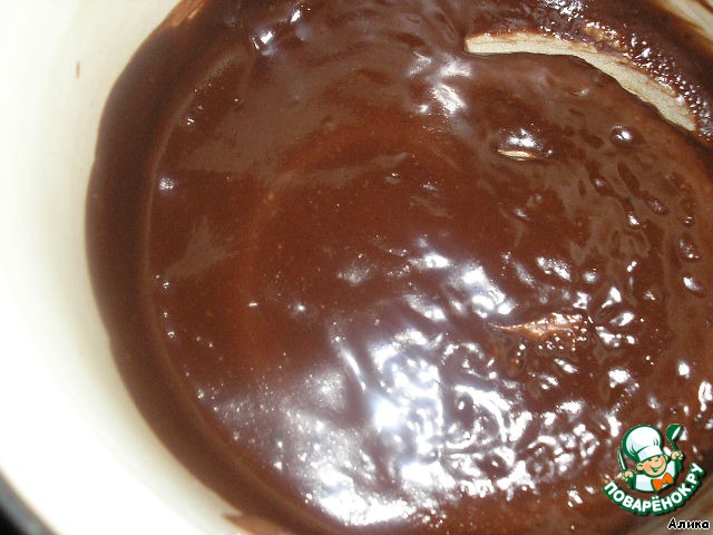 затем смазать кремом и сложить один на другой. Верхний пропитывать и смазывать кремом не нужно. Для него мы готовим глазурь. Сметану, сахар и какао варить на медленном огне минут 5, постоянно помешивая. Немного остудить и залить тортик.