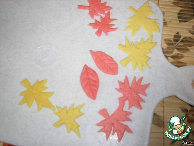 На досточке раскатываем получившуюся мастику и вырезаем листочки. Я раскатывала толщиной 1-1,5 мм, если тоньше делать, то вырезать фигурки не удобно.