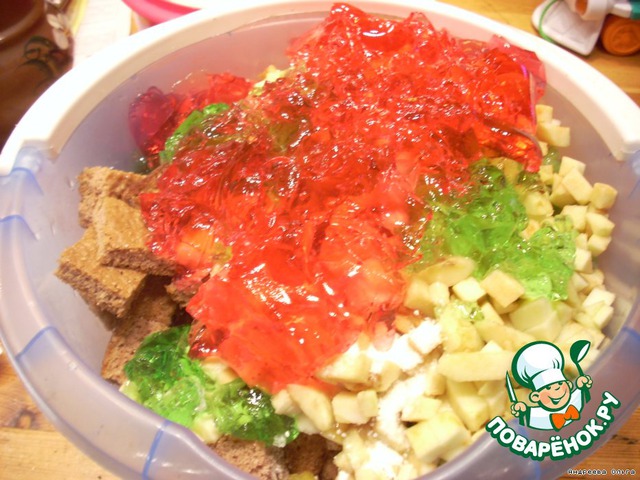 Заранее готовим желе по вкусу из пакетиков и тоже режем его в общую массу. Все соединяем.