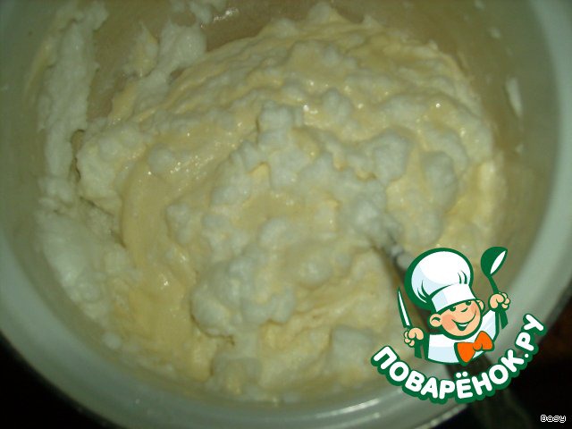 Желтки взбить добела с сахаром, добавить просеянные муку, крахмал и разрыхлитель. Отдельно взбить белки в стойкую пену и аккуратно вмешать их в желтки.