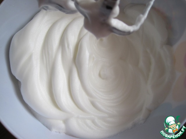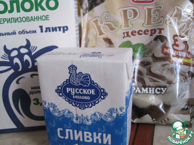 Крем я взяла готовый, но взбила его не просто на молоке, как указано на упаковке. Смешиваем 200 мл сливок (10%) и 50 мл молока (3,2%), высыпаем полуфабрикат крема и взбиваем до устойчивых пиков.