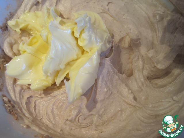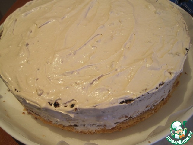 Промажем коржи кремом и соберём торт. Сливки для взбивания (38%) взобьём до устойчивой пены и подмешаем в отложенный ранее крем. Обмажем весь торт.