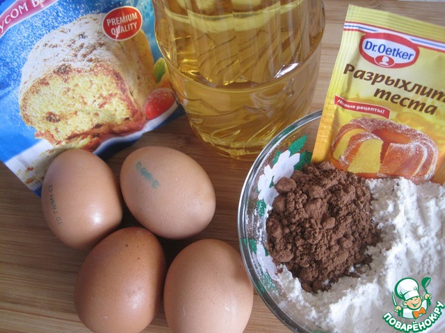 Пока выпекается светлый корж, сделаем тесто для тёмного. Муку просеиваем с какао и разрыхлителем.