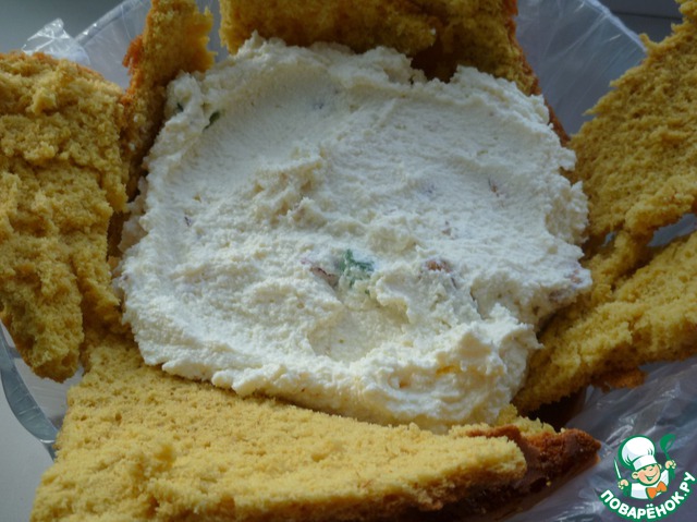 Круглый салатник выстелить пленкой (это нужно для того, чтоб потом было легче извлекать торт). Бисквит разрезать на 8 треугольников вытянутой формы. Высота треугольника должна равняться длине от центра салатника до края.