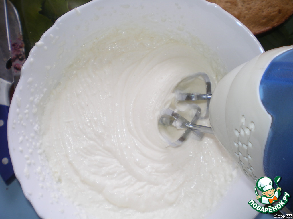 Далее готовим крем. Для этого нам нужно взбить сметану с сахаром. Если сметана очень жидкая, то можно добавить загуститель для сметаны. Я взбивала сметану миксером.