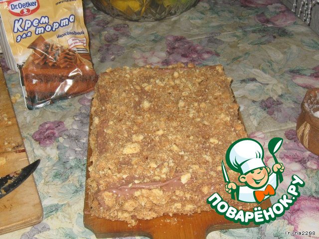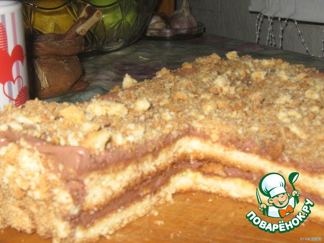 Пропитать коржи кофе, промазать кремом, украсить крошками и в холодильник - на пропитку.