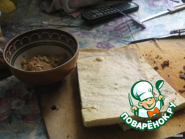 Готовый бисквит нарезать на произвольное количество частей (я немного передержала его в духовке, т. к. дочка мешала постоянно)