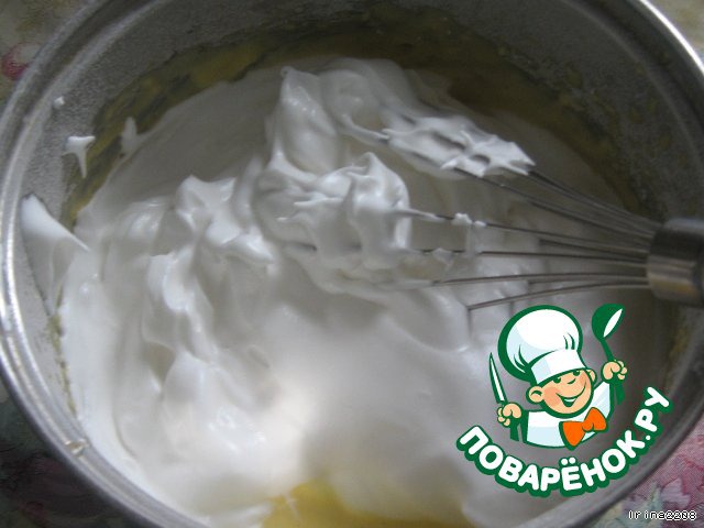 Белки взбить с оставшимся сахаром и осторожно вмешать в тесто