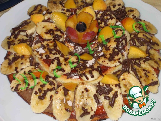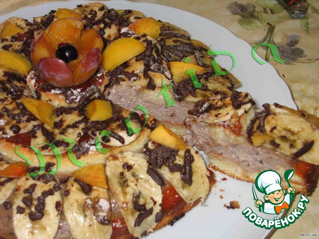 | .... бисквитная основа... творожно-йогуртно-фруктовая заливка.... немного абрикосового джема... коньячка для пропитки.... бананы, нектарин, слива..... и шоколад.. вот такой вот каскадик получился :) |