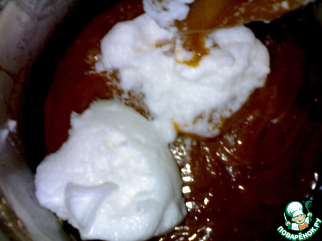 а в остальное добавить соду, муку, 3 желтка (по одному) и взбитые в крепкую пену белки. Все осторожно, но тщательно вымешать. Выпекать в 2 приема (если у Вас форма 22 см в диаметре) или же в 1 прием и готовый корж разрезать пополам.