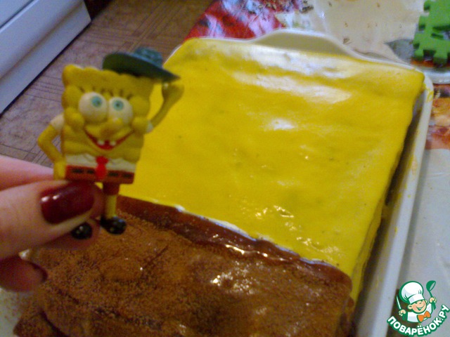 Размазать желтый крем по всей длине, с боку вылить глазурь (штаны) и чуть посыпать сверху какао (для застывания убирать в морозилку на 5 мин.)
