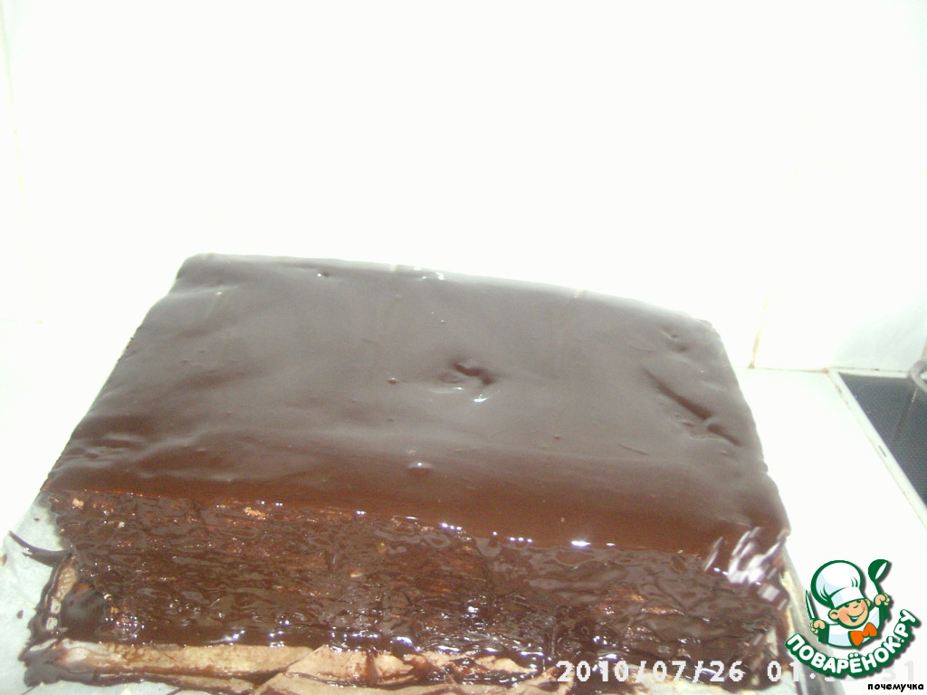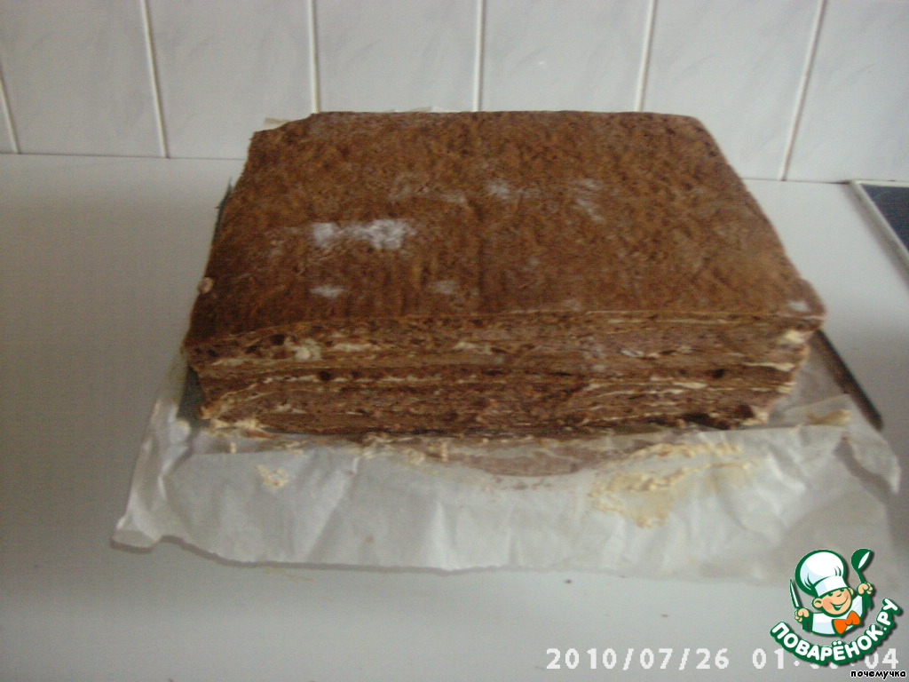 Оставим торт на столе на 2 часа при комнатной температуре, только в этом случае коржики пропитаются кремом и станут мягкими,