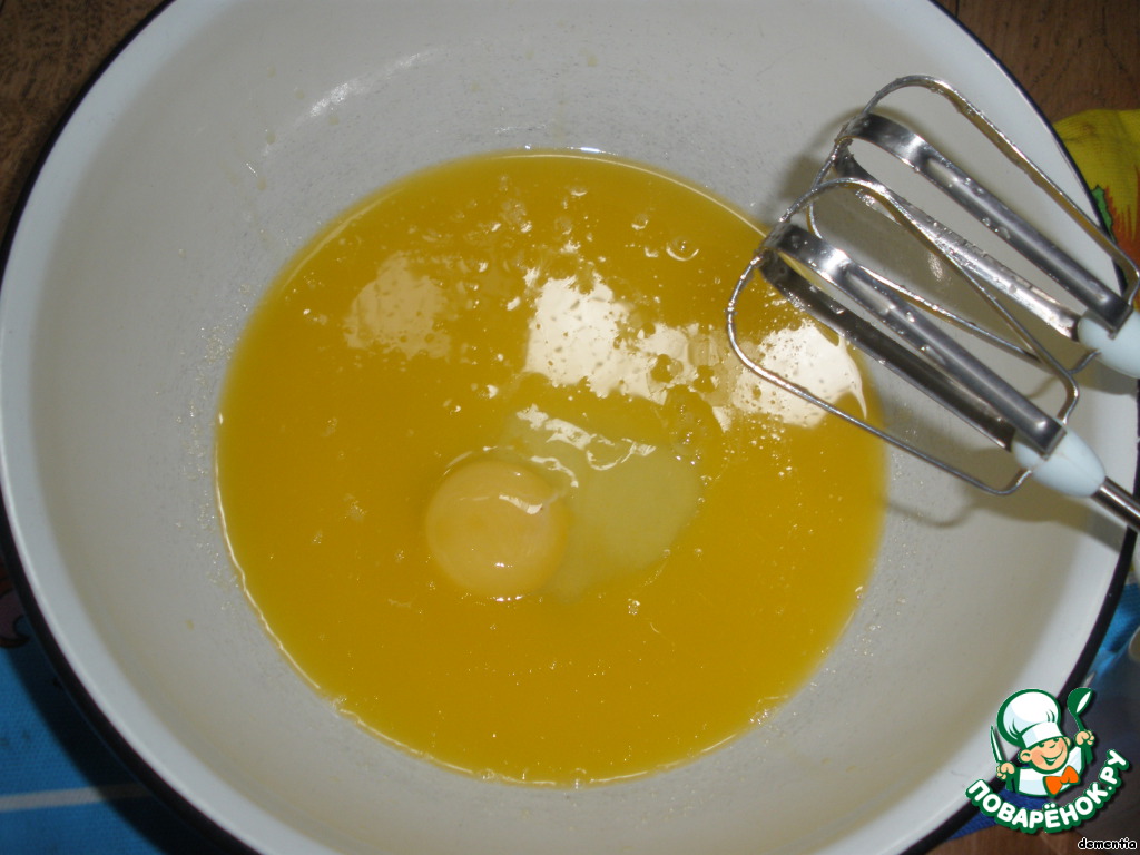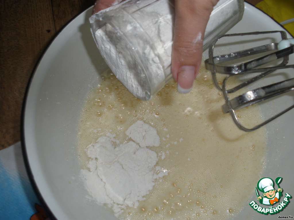 Всыпаем муку+разрыхлитель в 3 приема. Взбиваем.