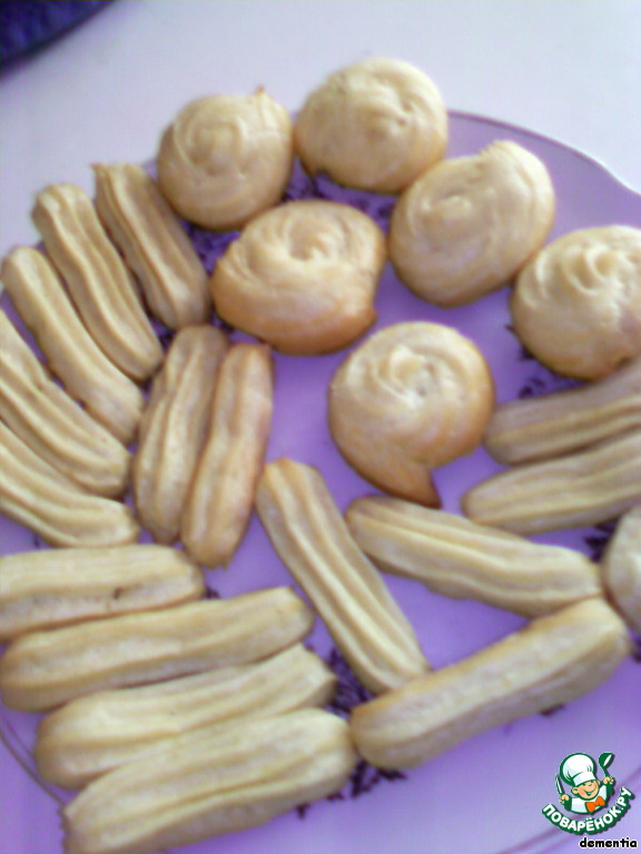 Противень застилаем бумагой для выпечки. Кондитерским мешком (или ложкой) формируем на бумаге шарики или трубочки, оставляя место между фигурками, т.к. тесто вырастет. Ставим в духовку и выпекаем до золотистой корочки, около 40 минут. НЕ ОТКРЫВАЕМ духовку, пока эклеры пекутся.