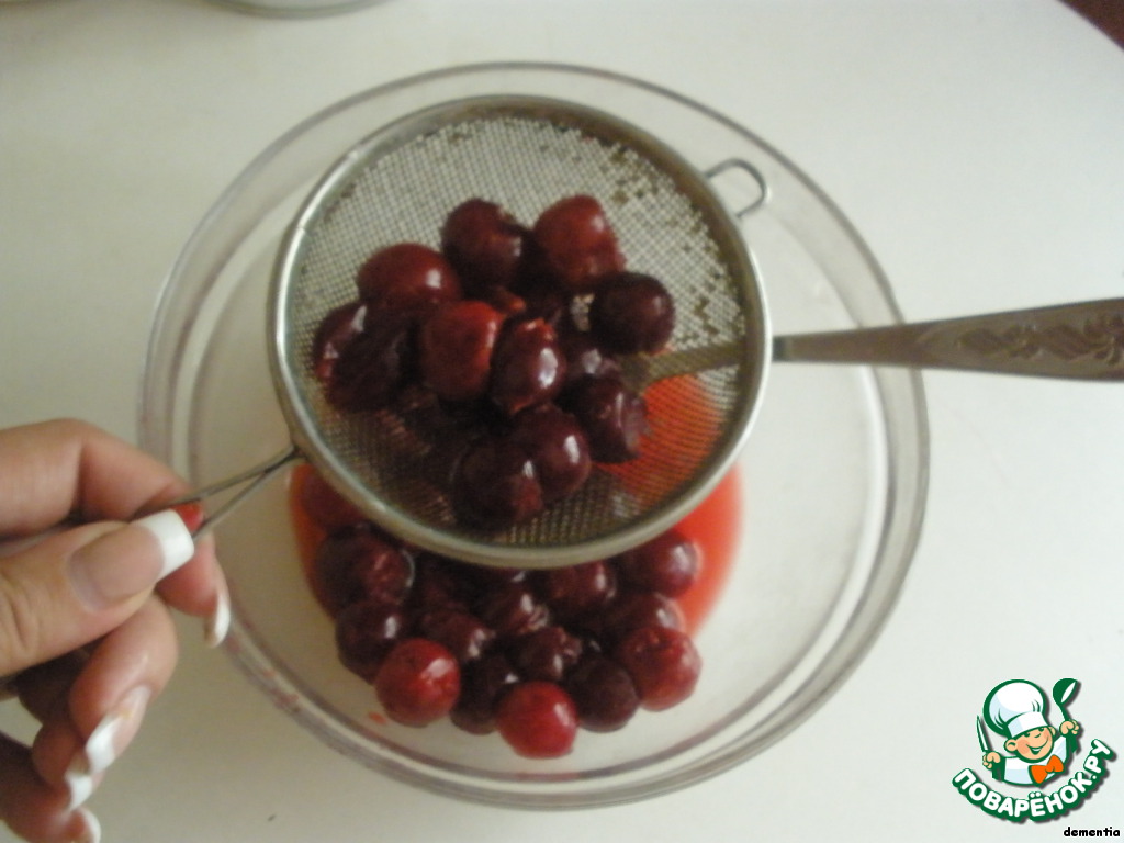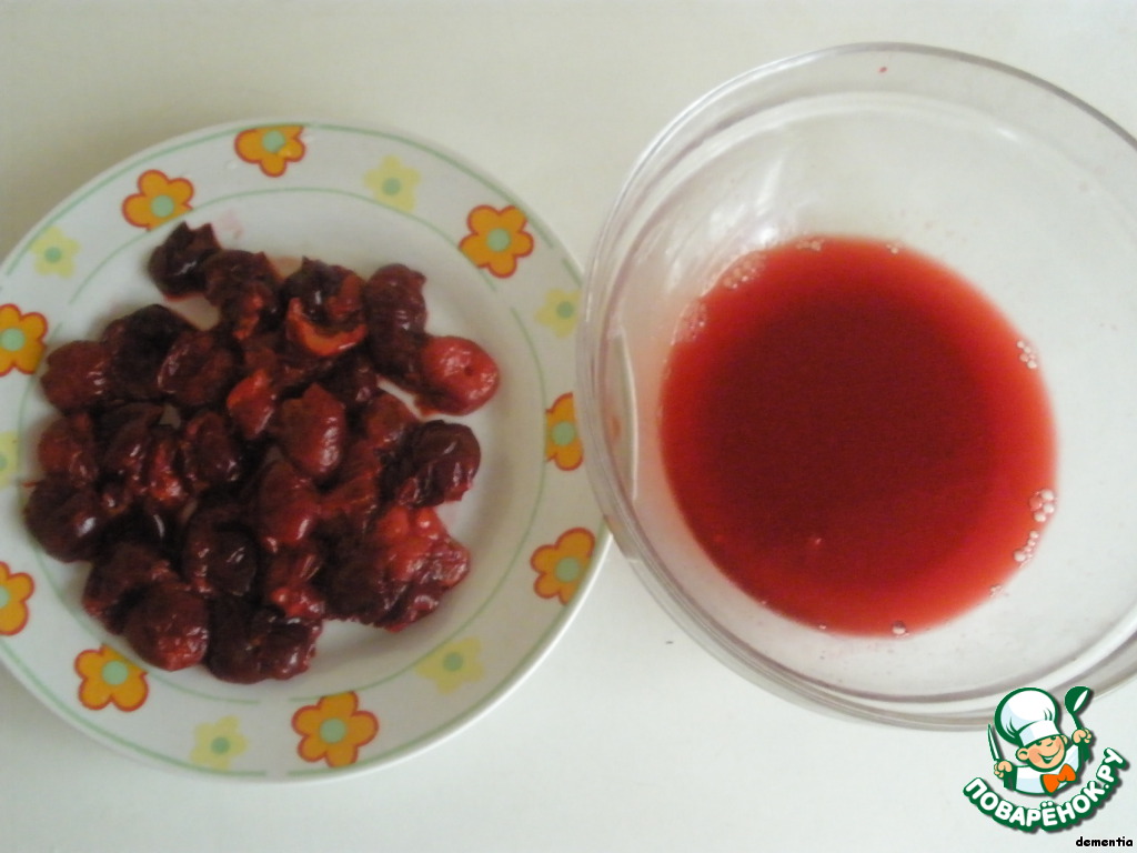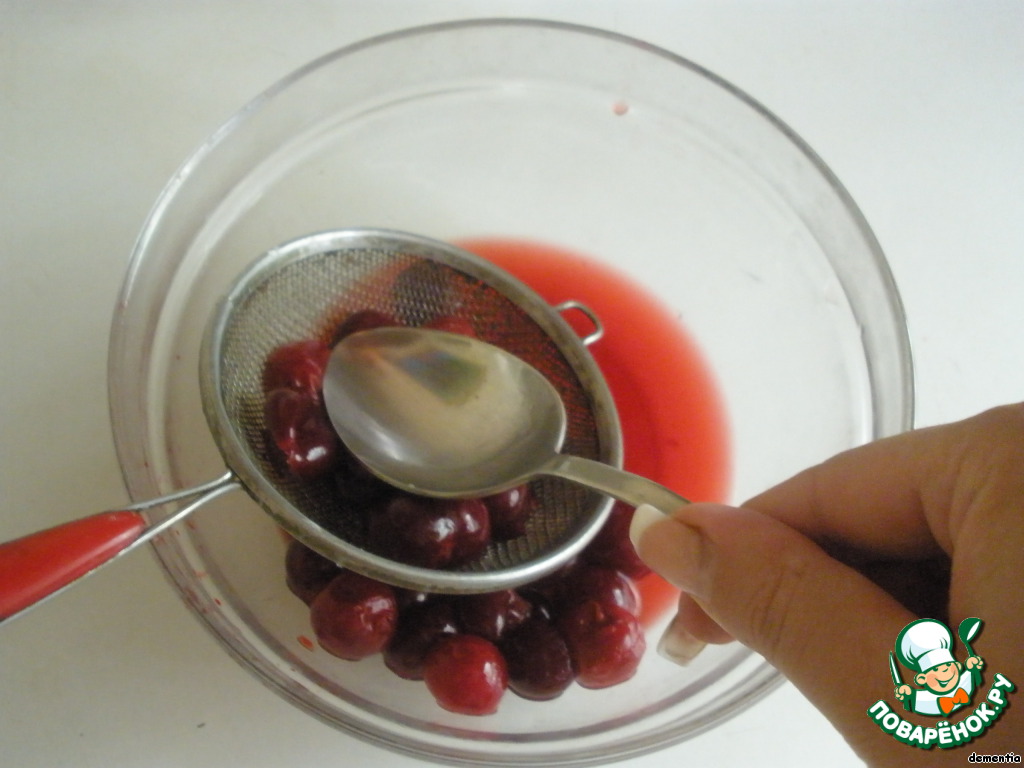 1й корж не пропитываем, чтоб не размяк. Покрываем кремом №2, Сверху - 2й корж, пропитка, крем №2. Затем 3й корж, пропитка, крем №1, половина эклеров(вдавливаете потихоньку в крем). Выкладываем ягоды вишни.