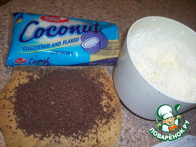 Разделить на две части, в одну добавить какао и половину шоколада, натёртого на терке, в другую, кокосовую стружку и ванильный сахар.