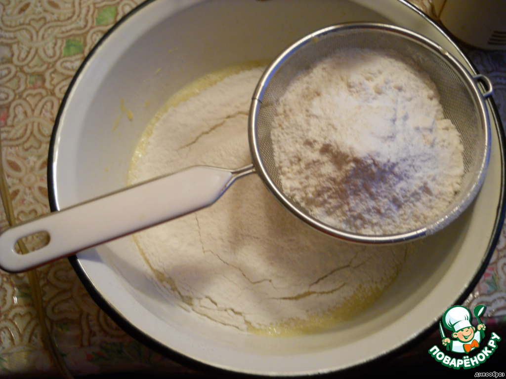 Всыпать сахар, просеянную муку с разрыхлителем.