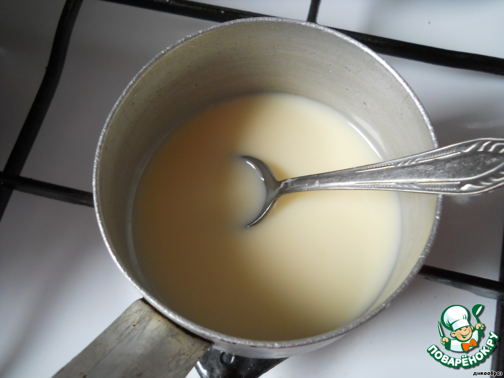 Пока печется пирог, нагреть молоко, но не до кипения. Влить оставшееся сгущенное молоко, размешать.