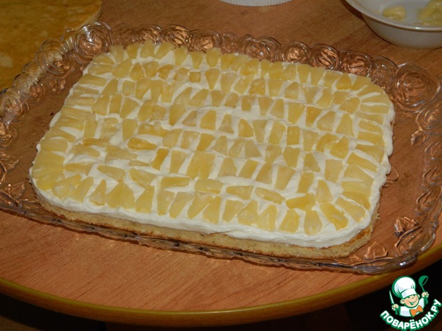 Корж пропитываем сиропом от ананасов, мажем кремом, и выкладываем ананасы.