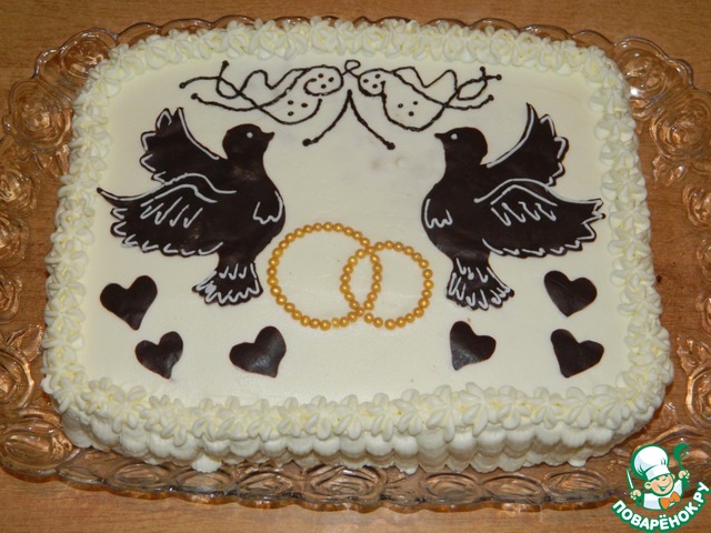 Украшаем на свое усмотрение. Так как у меня был торт на заказ, поэтому украшен на свадебную тему. Голуби у меня были нарисованы растопленным шоколадом отдельно на бумаге, колечки из сахарных бусинок.