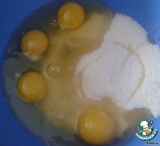 Взбиваем яйца с сахаром, добавляем ванилин, разрыхлитель, крахмал и муку. Крахмал дает тесту рассыпчатость и дополнительную нежность.