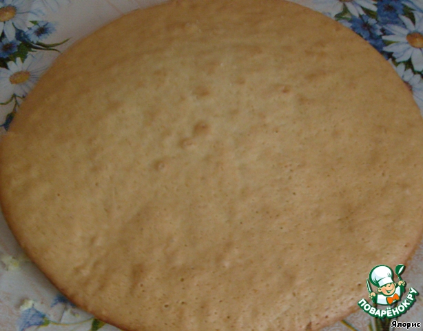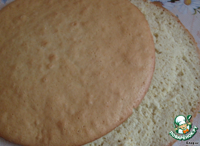 Готовый корж остужаем слегка и разрезаем очень осторожно так, чтобы получилось две неравные части - верхний слой потоньше и где-то 2/3 коржа - нижний слой.