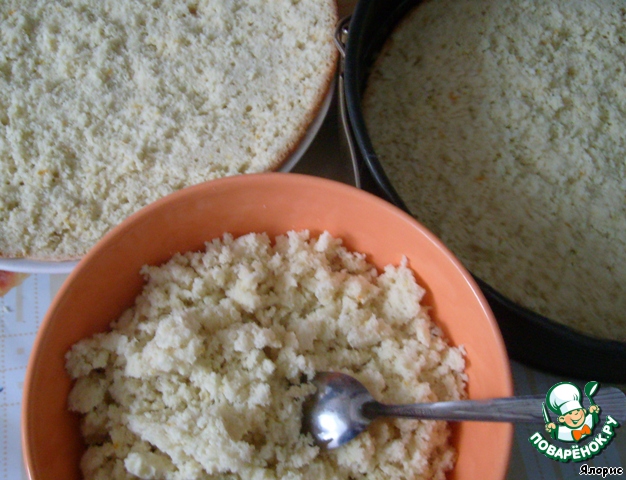 Мякоть коржей измельчаем руками и перемешиваем с абрикосовым джемом и сливочным маслом. Из пластичной массы формируем шарики и наполняем ими нижнюю чашу коржа.