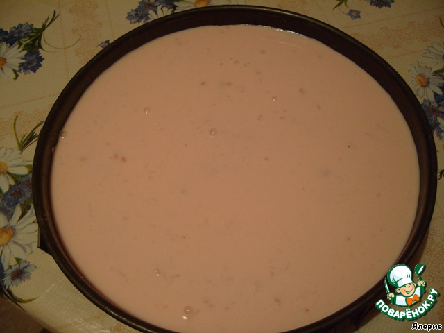 Заливаем клубничным слоем. Чтобы клубничное желе не успело застыть, пока торт охлаждается в холодильнике, я его перемешивала несколько раз и старалась держать в тепле.