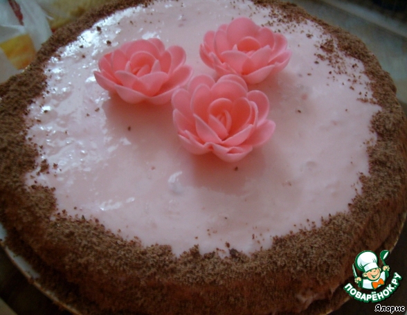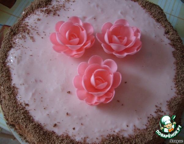 Примерно через 30 минут - для верности надо проверить прочность вернего слоя - можно торт украшать. Он получился сверху потрясающе нежного розового цвета - не знаю, смогла ли я передать на фото этот оттенок.
