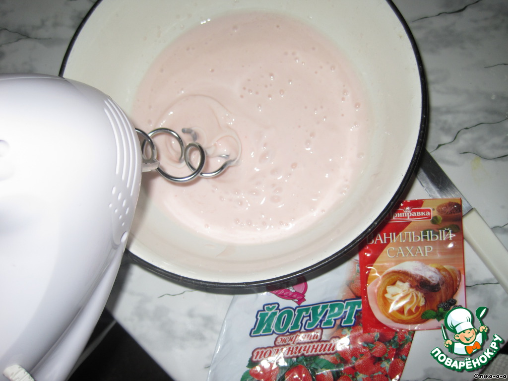 Выливаем йогурт в миску, добавляем сахар, ванильный сахар и взбиваем миксером около 5 минут.