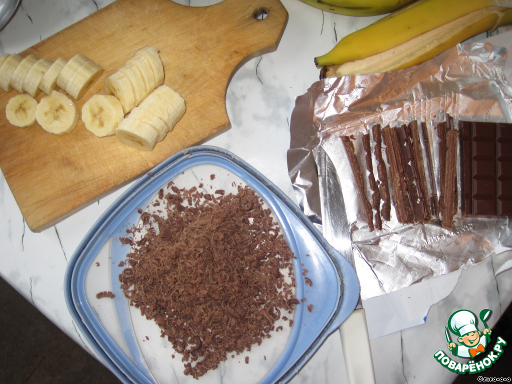 2 банана режем кольцами по 1 см, третий банан - более тонко. Половину шоколада натираем на крупной терке, вторую половину режем тонкими полосками.