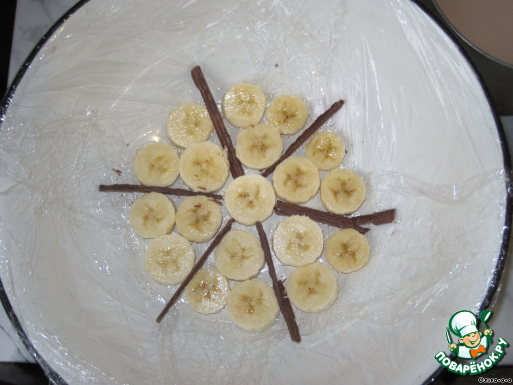 Глубокую посуду застилаем пищевой пленкой. Выкладываем бананы и полоски шоколада.