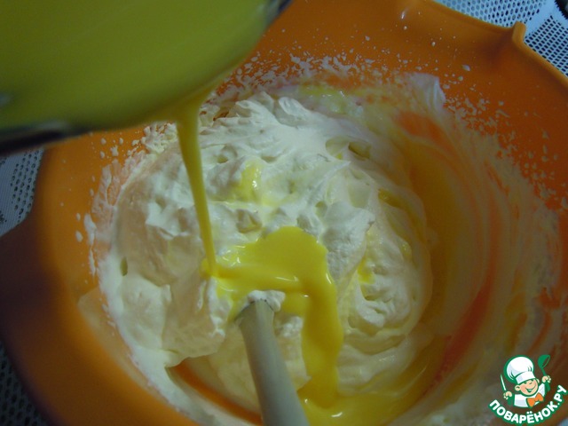 Взбейте 400мл сливок до полного загустения. Отожмите от воды 5 листков желатина и разогрейте в кастрюльке на маленьком огне до растворения. Добавьте 2 ст. л. яичного ликера при постоянном помешивании, затем добавьте весь ликер, снимите с огня. Маленькими порциями добавьте в сливки, хорошо перемешивая.
